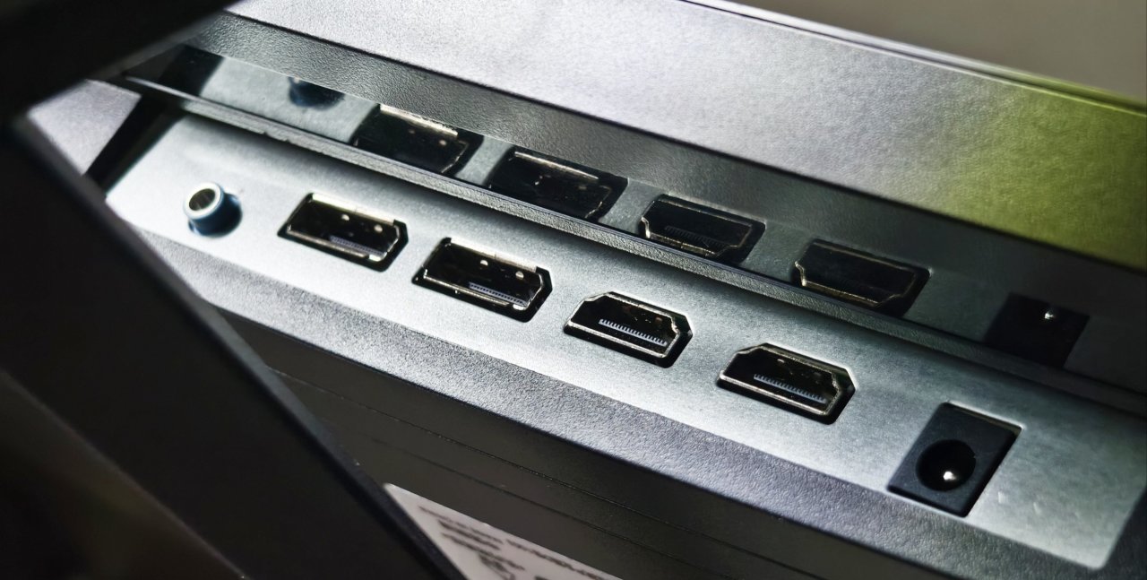 接口方面都在顯示器的底部,按順序排列分別是:電源線,HDMI接口,HDMI接口,DP接口,DP接口