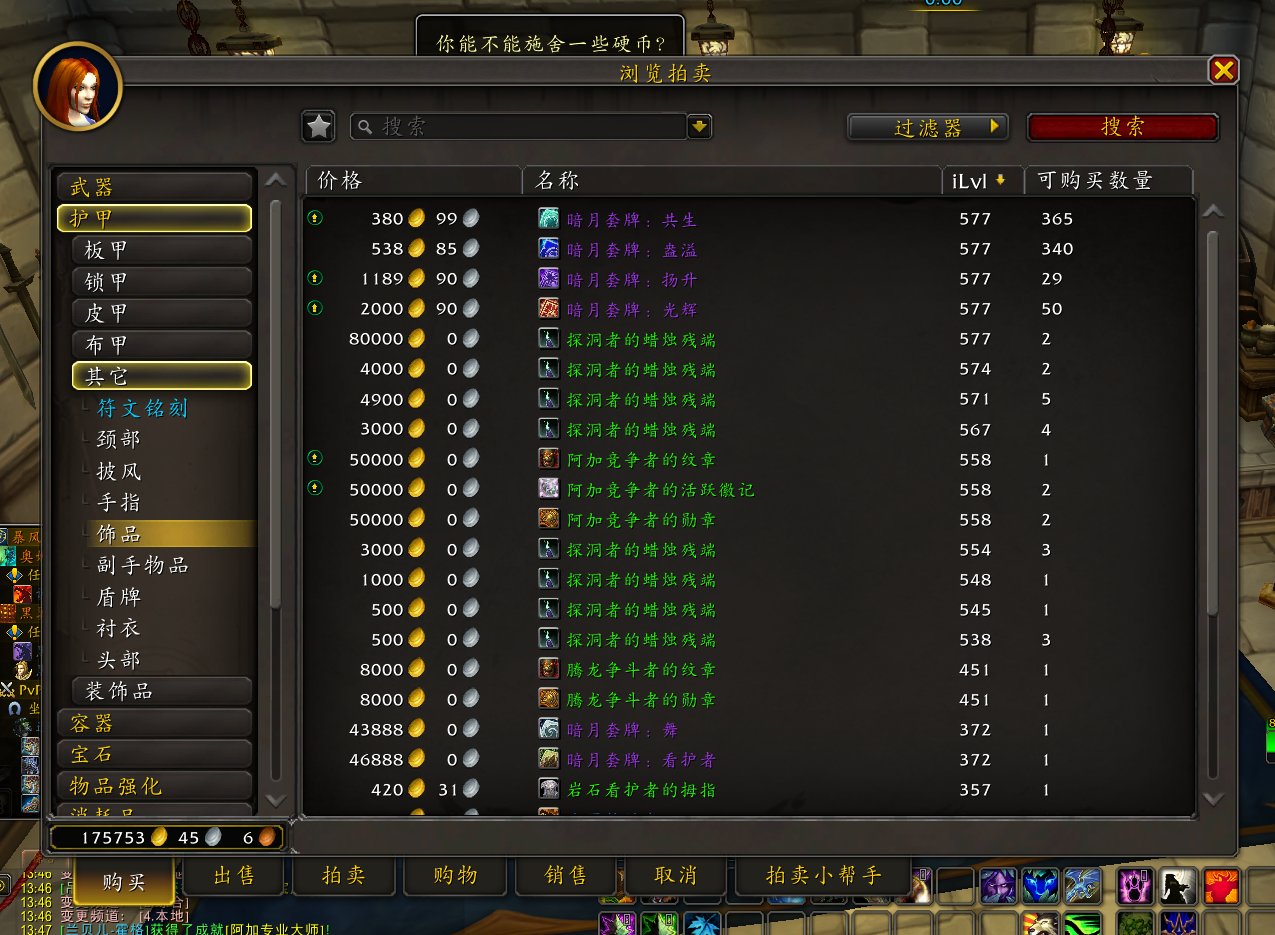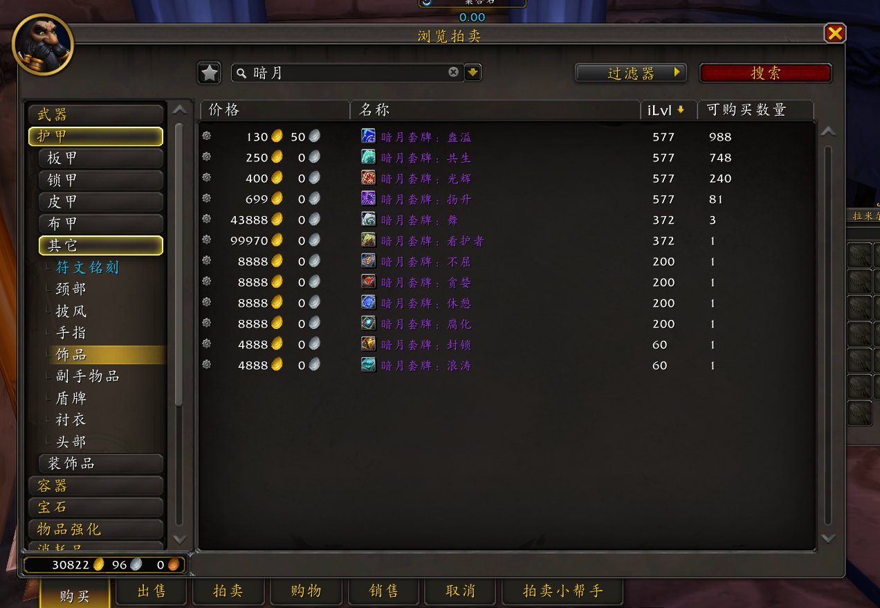 這幾天刷坐騎的隊伍特別多,坐騎的副產物就是皮革、布匹、暗月卡牌、綠裝。由於供給遠遠大於需求,導致目前這些素材的價格特別低。577裝等的暗月套牌只要100金是沒想到的。