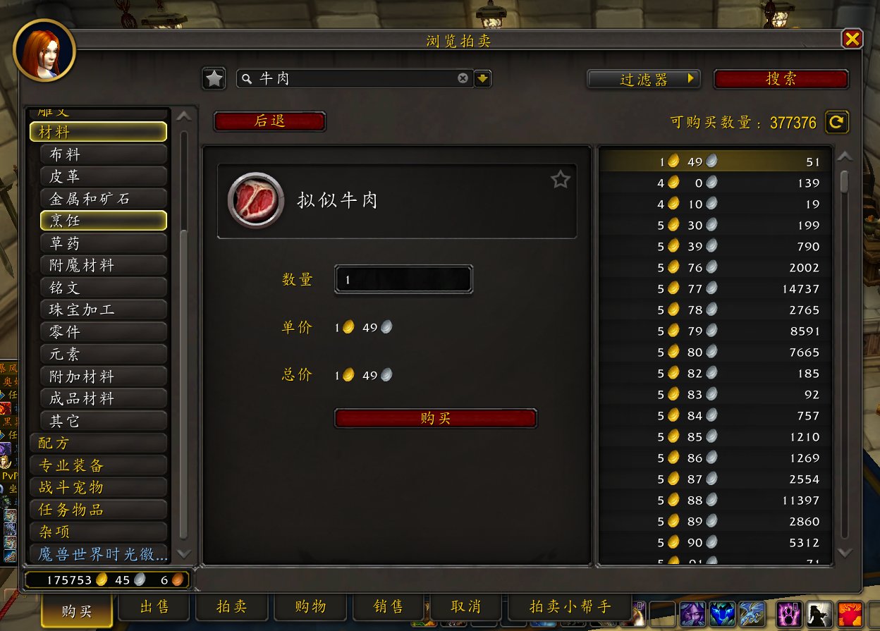 題外話,這幾天不知道爲什麼各種烹飪材料,包括「擬似牛肉」的價格都被炒得很高(我大前天練烹飪的時候價格基本在10-40銀,今天一看都4金了)一般來說最近刷坐騎的人這麼多產量應該很大,練級也喫不了多少,不知道誰在大量屯。
