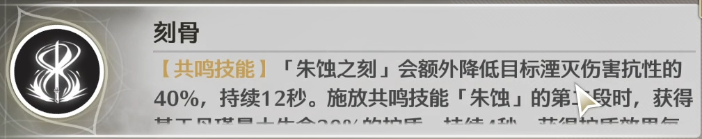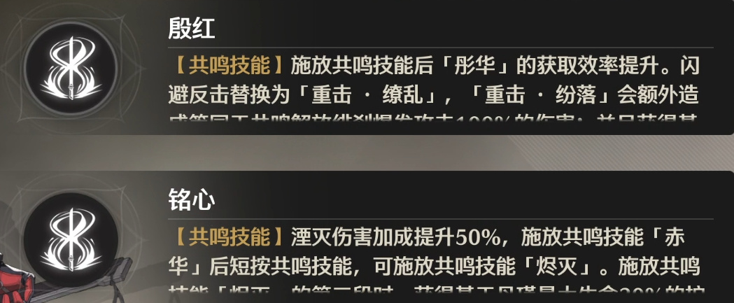 【殷红】能让你的闪避反击/消耗技能条的重击多出一段大招伤害。