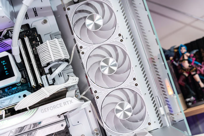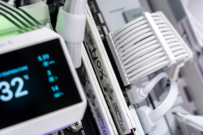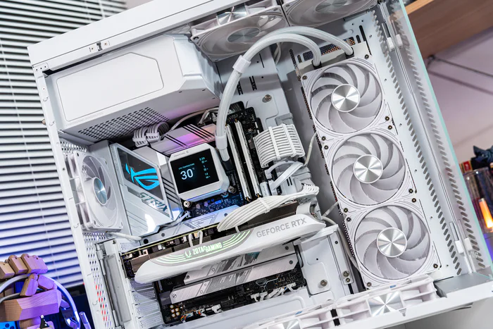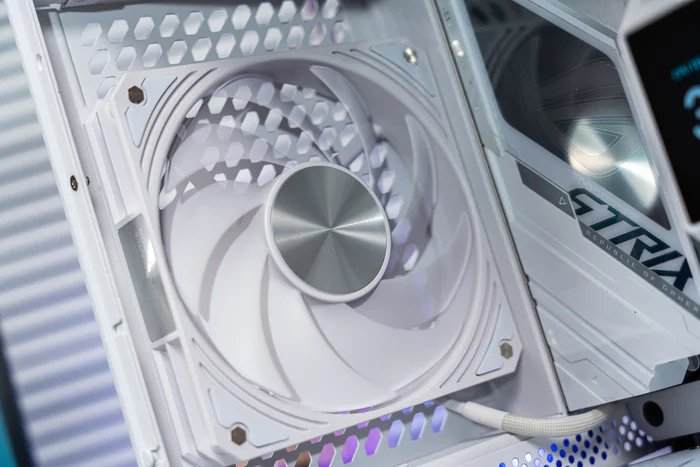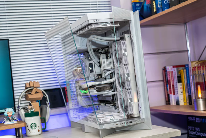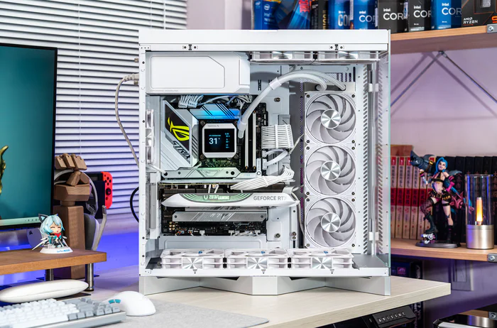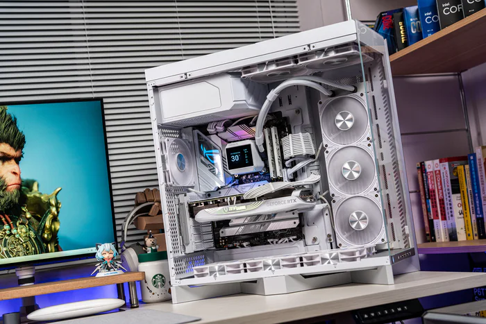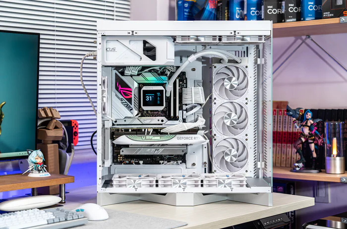 其他配置方面,散熱使用的是九州風神最新的冰暴360白色款,它採用九州風神全新的全棧自研第五代高性能水泵,以及高性能DF12ARGB風扇和全新的MYSTIQUE智能控制軟件,重要的是冷頭也加入了時下流行的IPS屏。 內存使用了宇瞻NOX暗黑馬甲套條,DDR5 6400頻率配合矮條馬甲鋁合金散熱運行非常穩定,並支持intel XMP與AMD EXPO雙認證。固態硬盤是三星990PRO 1TB,其採用8nm製造工藝代號爲PASCAL全新自研主控和三星第七代V-NAND TLC閃存。電源是海韻最近新出的FOCUS新版V4 GX1000白色限定版電源,主動式PFC+全橋LLC+同步整流+DCDC結構配合OptiSink高效導熱技術和模塊化線路設計,以及CHROMA MES 先進製程工藝以及高規格用料,使得整體性能及散熱效率再次獲得提升,13.5cm的FDB風扇配合14cm機身,原生12V 2x6 16-pin接囗及全套壓紋模組線,16AWG線徑和9.2A耐高電流鍍金端子,以及10年質保和升級終於純白的白色限定版。最後風扇配備了雅浚ProArtist 的高端準工業扇H14PE和H12PE爲整機的散熱提供了更有利的保障,這兩款風扇都爲全LCP液晶聚合物材質高端準工業級風扇,其中H14PE爲3000轉雙滾珠軸承,H12PE爲3300轉MFDP軸承,都有三檔PWM調節開關。