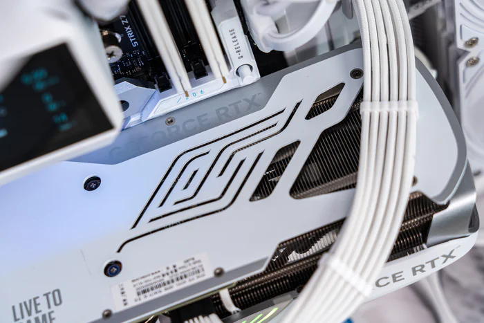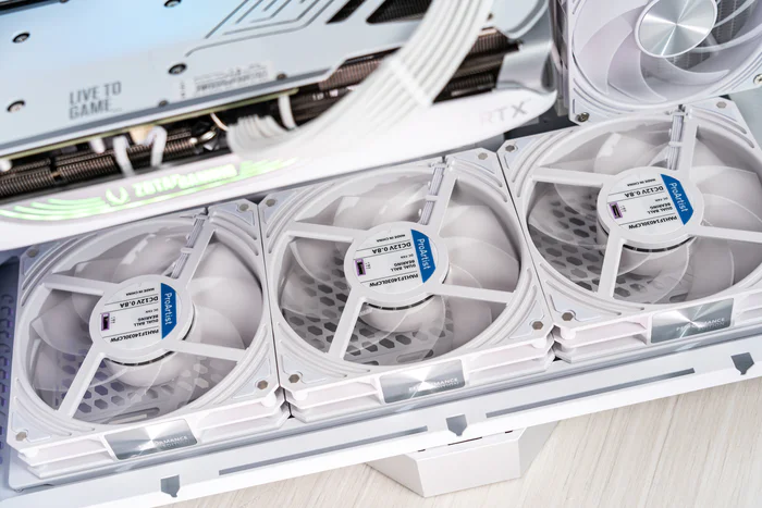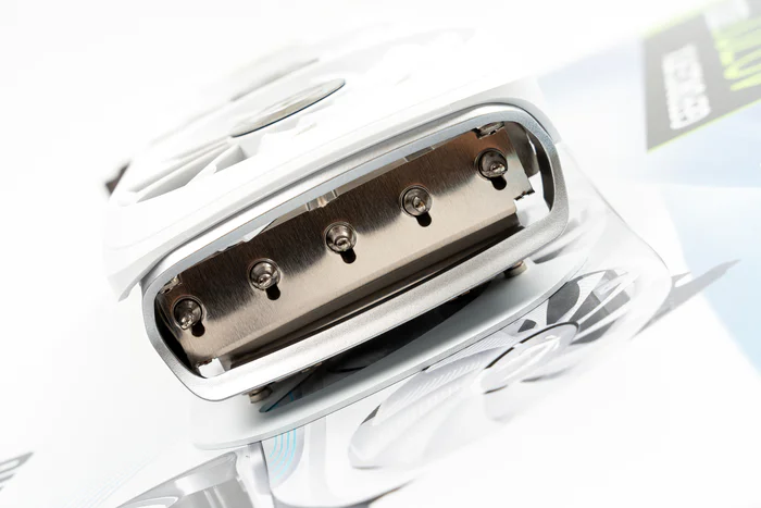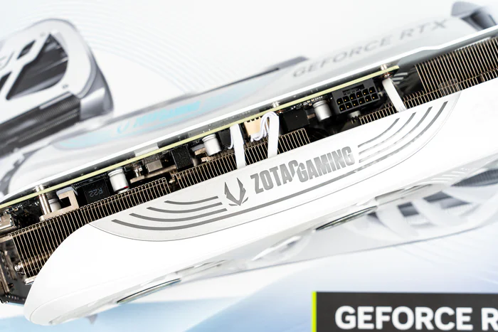 顯卡的本體,索泰4070TI SUPER 16GB TRINITY OC 月白顯卡採用了純白配色,整個IceStorm 2.0 散熱系統都是純白,四周爲弧度設計呈橢圓形狀,9cm仿生盾鱗2.0風扇提升風量、風壓和風流