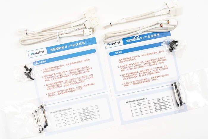 H14PE和H12PE都採用泡棉包裹,附件都主要是延長線1根和1分2線一根,都是包網材質非常好,非廉價的普通硬硬的蛇皮網,還有自攻螺絲和冷排螺絲各4顆(這是青春版帶的冷排螺絲,而標準版則有配置4顆快裝螺絲),說明書一份,並有四點注意事項,最後是三檔的說明,其中H14PE的三檔分別是L檔400-1000RPM,M檔500-1800RPM,H檔500-3000RPM;而H12PE的三檔分別是L檔500-1800RPM,M檔800-2200RPM,H檔1400-3300RPM