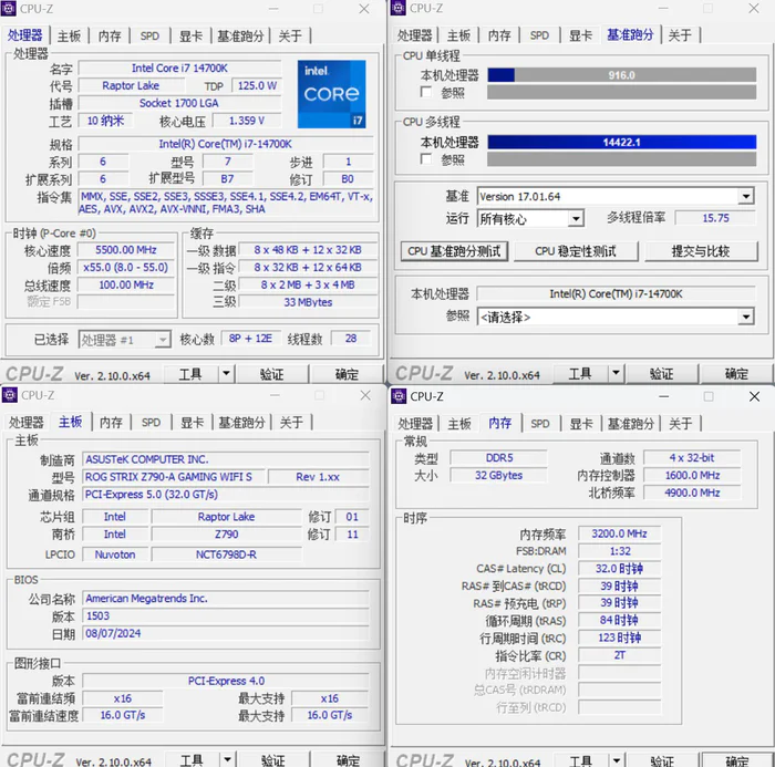 CPUZ 測試14700K的單核916分,多核14422.1分