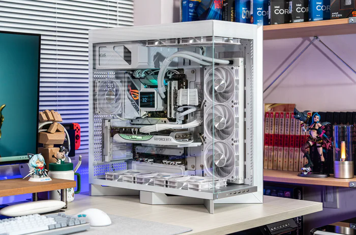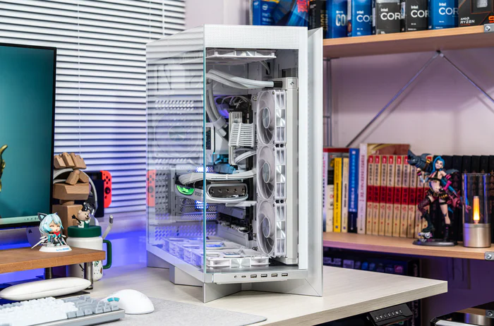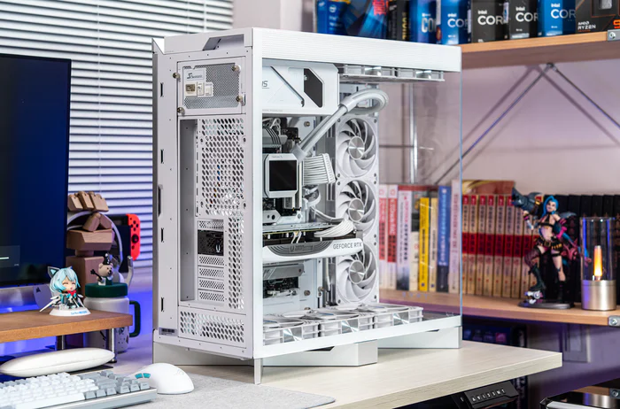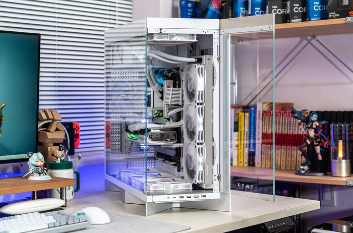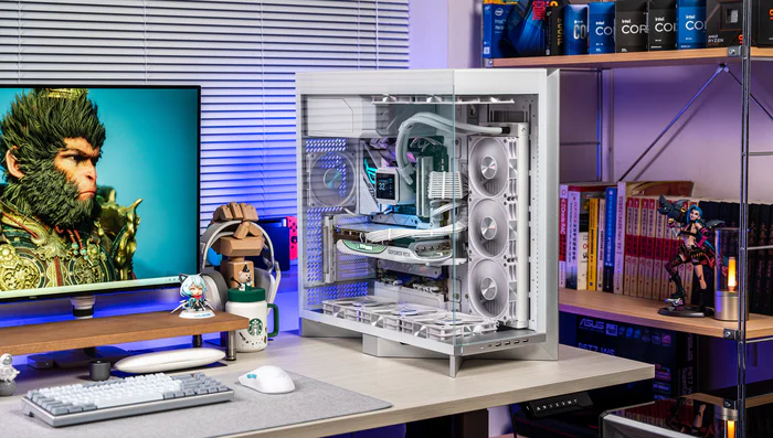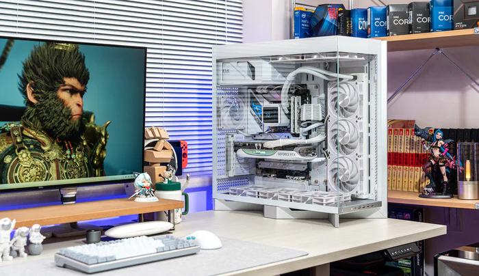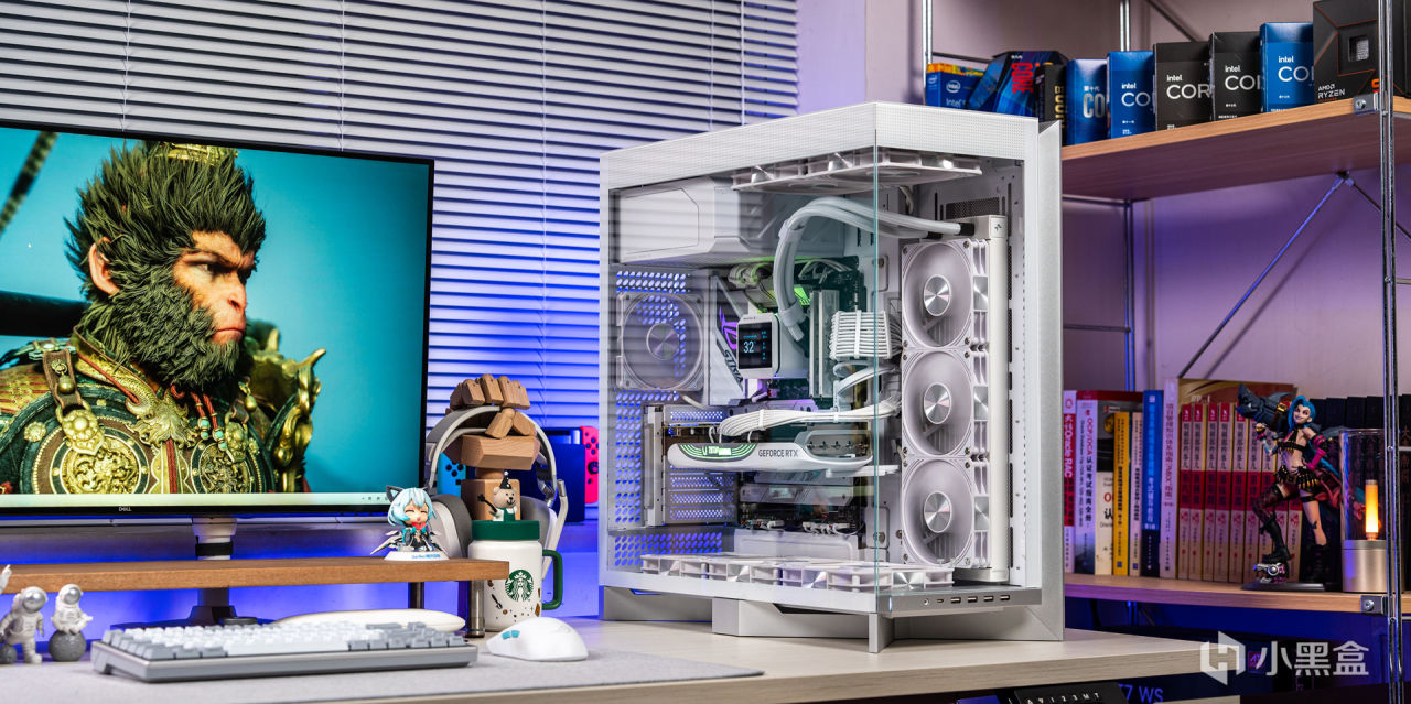 今天帶來的是一臺黑神話悟空的遊戲機,使用的是14700K+華碩Z790吹雪S+索泰4070TI SUPER 月白的白色配置,搭配新晉品牌TRYX 創氪星系的LUCA路氪 L70的白色機箱。TRYX LUCA L70中塔EATX機箱具有540.4x261.8x571.85mm的長寬高三圍尺寸,可以兼容460mm長度顯卡、雙420水冷與EATX主板,但也具有獨到的設計理念,例如設計了45°切角玻璃與通透視野的海景房設計,能夠通過模塊化的佈局將主板托盤與電源倉進行拆卸並可互換位置,底座也是設計了40mm高度的雙X型懸浮底座,散熱上最高支持8x140mm+1x120mm風扇,最高兼容雙420冷排位,並且整機的外骨骼都採用6系航空鋁合金,內骨架1mm SGCC鋼材,前面板的鋼化玻璃還使用了免工具開門設計,並且機箱包裝也是貓屋設計可進行二次利用。