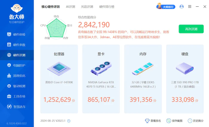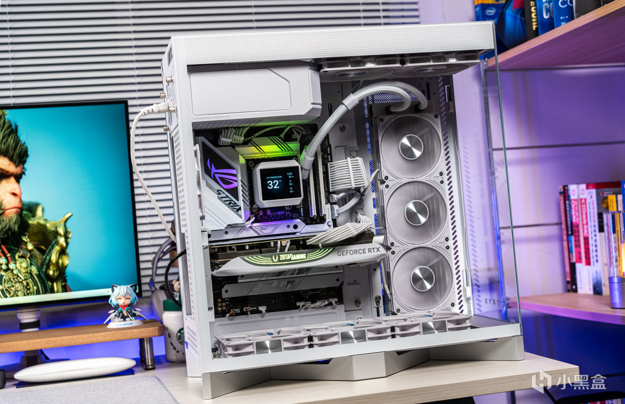 配置方面,使用了14700K+華碩 ROG STRIX Z790-A GAMING WIFI S 吹雪主板的組合。華碩吹雪ROG STRIX Z790-A GAMING WIFI S主板依然是吹雪經典的外觀以及16(70A)+1(70A)+2的強力DIGI+數字供電供電模組,當然對比上一代散熱面積更大了,而且M.2已經支持到了5個,存儲黨們的狂喜,規格上海加入了WIFI7的支持和內存引入了更強的DIMM FLEX智能溫控優化技術,讓內存頻率也支持到DDR5 8000,且容量也升級至最大256GB。顯卡是索泰4070TI SUPER 16GB TRINITY OC 月白顯卡,核心採用NV Ada Lovelace架構、TSMC 4N工藝的AD103-275,它使用了源於空氣動力學氣流優化設計與3風扇6熱管的IceStorm 2.0 散熱系統,並使用9+2相高規格供電工藝與SPECTRA RGB燈效,整卡的TGP功耗爲285W,尺寸只有306mm長、119mm高、58.5mm厚度。