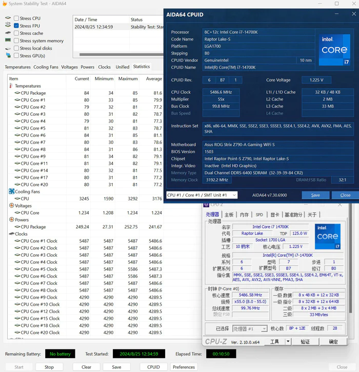 對cpu進行offset-0.075v,單烤機FPU10分鐘之後,14700k功耗在249W左右,溫度基本在84°左右(室溫28°),並且保持在全大核5.5G與全小核心4.3G的頻率
