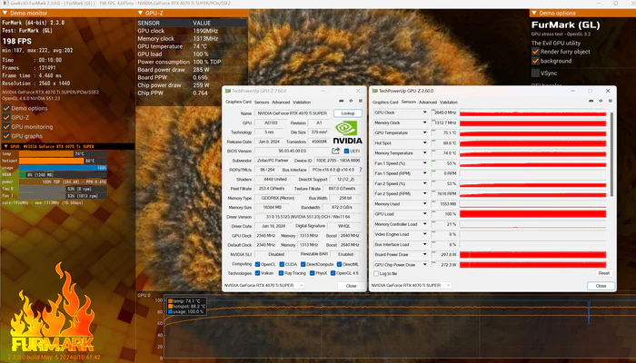 甜甜圈測試索泰4070TI SUPER 月白顯卡在10分鐘甜甜圈烤機之後溫度爲最高核心75.1°,熱點89.8°,顯存74°,風扇只有1800轉的53%,功耗在300W左右