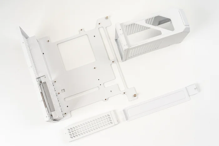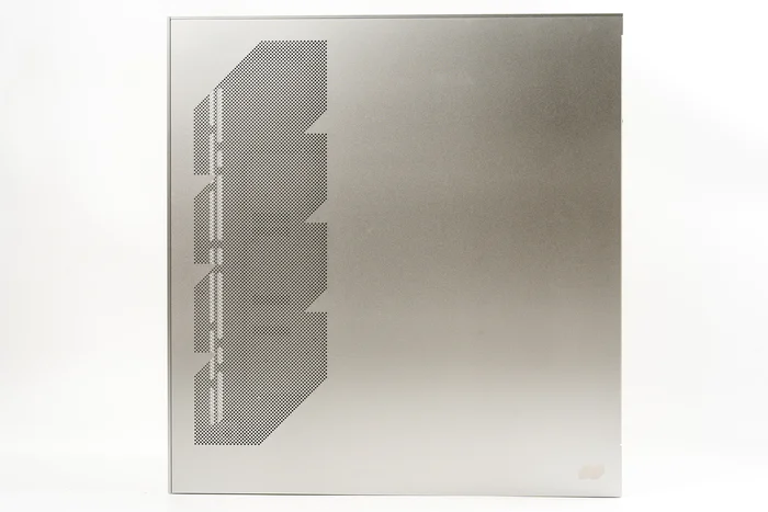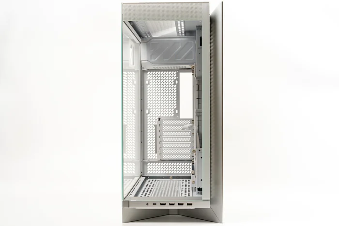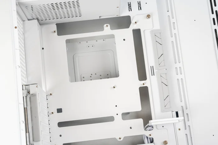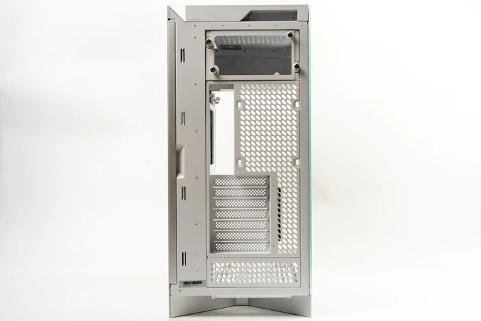 機箱的尾部,可以看到左側的背線空間應該相當充裕,而右側的上部電源倉、主板托盤、底部一塊麪板這三部分都是可拆卸的模塊設計,頂部的右上角有一個提手的位置,因爲頂部面板爲磁吸,只有這裏內部提供把手