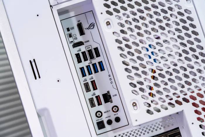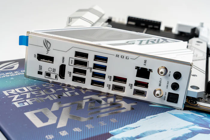 帶ROG logo的背板IO接口,依次爲Clear CMOS、BIOS FlashBack、集顯DisplayPort、集顯HDMI、4 x USB 2.0 Type-A、4 x USB 5Gbps Type-A、1 x USB 20Gbps Type-C、3 x USB 10Gbps(2A1C)、1 x Wi-Fi 7、1 x Intel 2.5Gb LAN、3 x 音頻接口