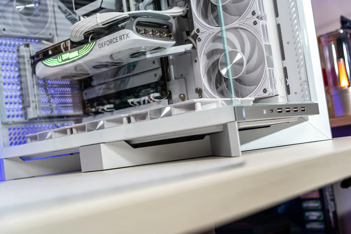 雙X形底座設計將機箱抬高了4釐米,顯著增強底部進氣量並營造了懸浮視覺設計