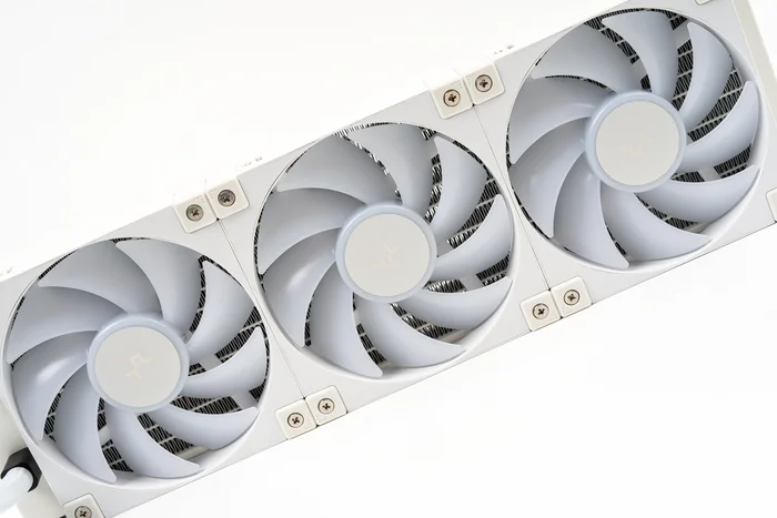 冷排上使用了3把DF12ARGB風扇,扇框採用全包膠設計,6顆第二代ARGB光珠,性能方面600-2400RPM區間下可提供最大風量72.04CFM、最大風壓3.48mmAq,滿載噪聲38.71dB(A)