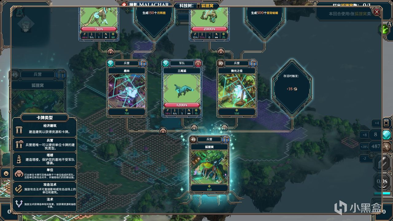 所有卡牌都有专属的科技树,发动其能力可以召唤建筑或单位,甚至施放法术。通过召唤经济建筑可以解锁更多卡牌,因此一定出牌得当,考虑好自己的科技树路线,以便拥有凶猛的怪物、毁灭性的法术和更多的能力。如果出牌不当,您很容易就会被碾压,只有回合计时器能拯救您的基地。