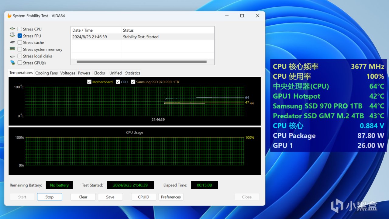 首先是積熱表現,9700X默頻單核FPU烤雞,功耗鎖定在88W。烤雞20分鐘溫度最後穩定在64度。