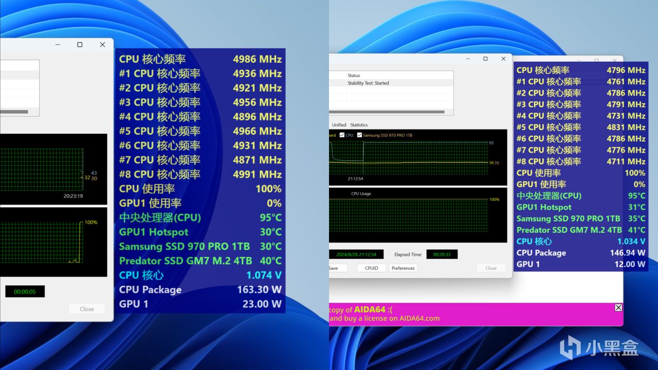 開啓PBO2設置後,單靠FPU,處理器溫度直接充上95度鎖定,360水冷全力輸出下,功耗前期摸到160W以上後迅速下降,最後保持在147W左右,如此低的功耗表現下,功耗下降並且溫度壓不下來,說明積熱問題仍然沒有很好的改善。