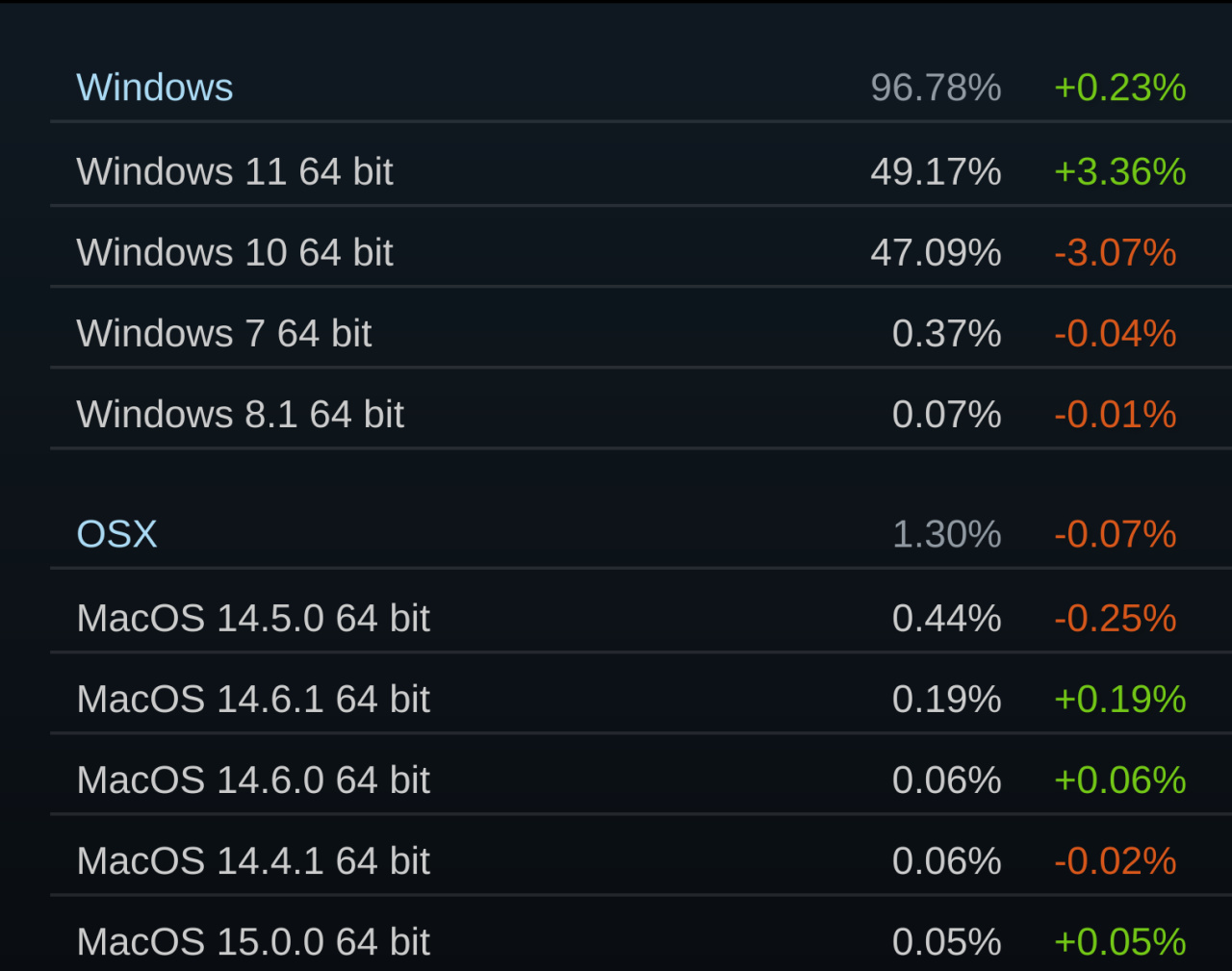 PC操作系統方面,使用Windows操作系統的玩家佔總數的96.78%,這其中Windows 11 64 bit以49.17%的佔比率高居第一,較上月增長3.36%,後續排名依次爲Windows 10 64 bit(47.09%)、Windows 7 64 bit(0.37%)、Windows 8.1 64 bit(0.07%)。而使用OSX的玩家則依然佔比較少,僅爲1.30%。