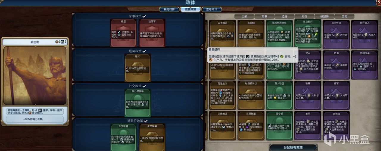 ②部分政體政策也會增加食物收益如:集體化政策爲國內貿易路線+4食物。民主主義政體,通過與同盟國城市 貿易路線爲雙邊城市+4 食物。