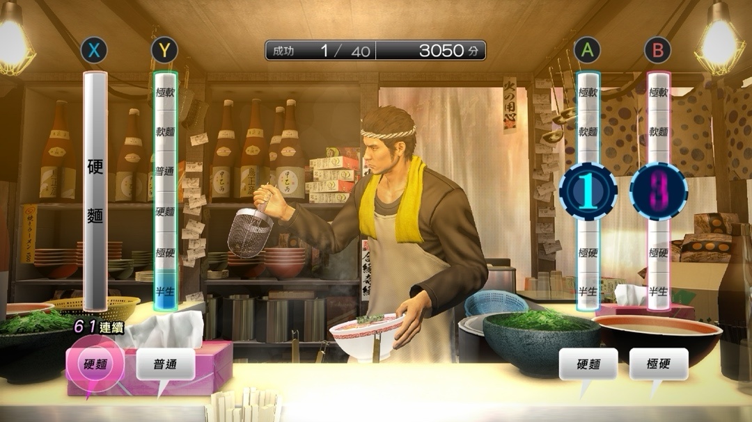 桐生從如龍3高手系列之後,又一力作,竟化身爲拉麪師傅,根據不同客戶的需求拉出不同程度的麪條,滿足各種胃!男神異聞錄名不虛傳,誰說中年男子不能打工?這一身更有別樣的男人味兒!完成後,會得到不同評價的工資獎勵,是遊戲前期賺錢的好方法之一~(Level up!!!)