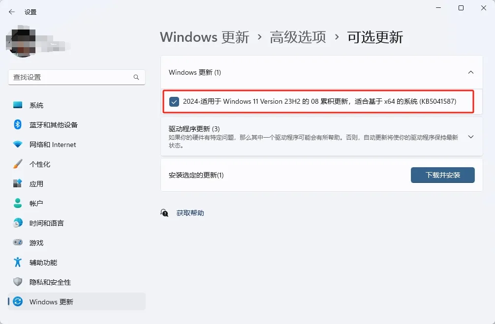 不想使用 24H2 預覽版或正在苦等正式版的同學,可前往 Windows 更新-高級選項-可選更新菜單中找到這一補丁(KB5041587)進行下載安裝。