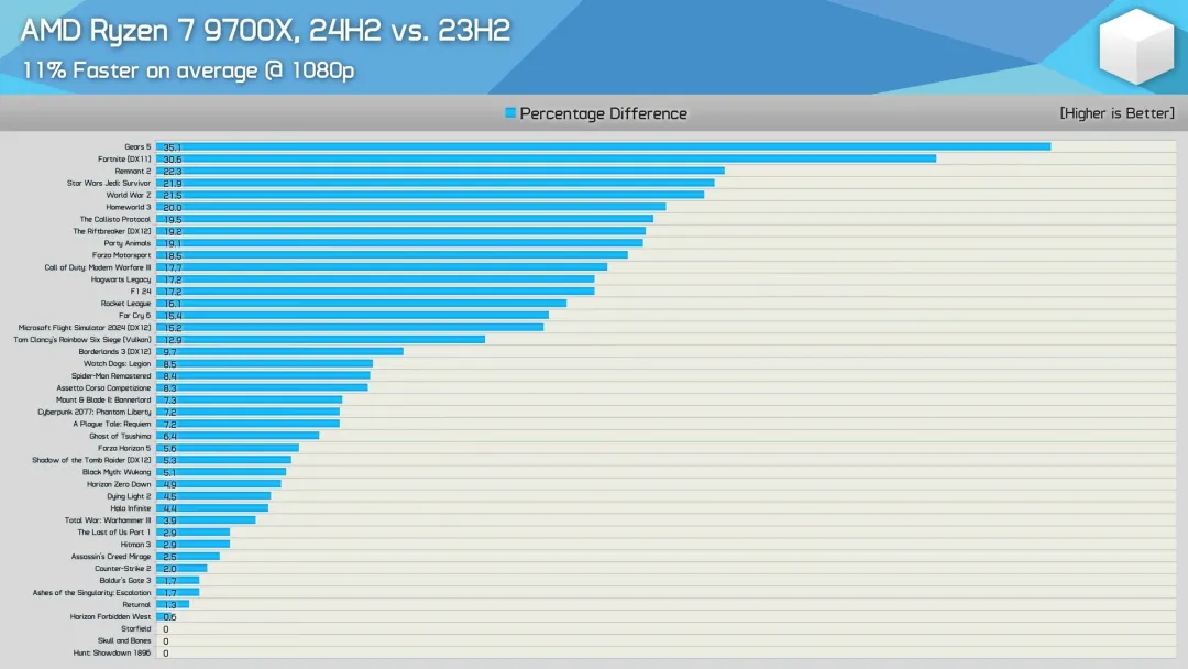 AMD 表示,在包含了分支預測優化但還未正式發佈的 Win 11 24H2 中,銳龍 9000 遊戲性能提升最高可到兩位數!