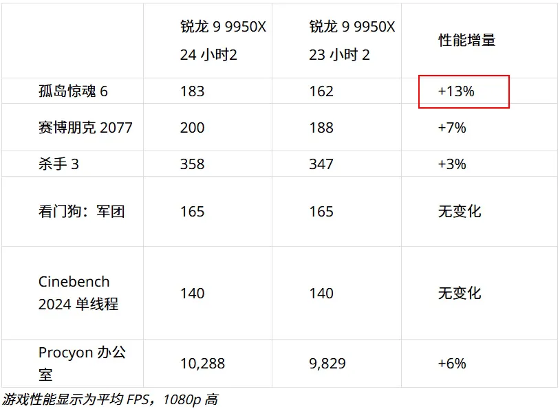 測試中銳龍 7700X 多款遊戲幀率相較 Win 11 23H2 平均提升同樣有 10% 左右,部分遊戲提升超過 30%。