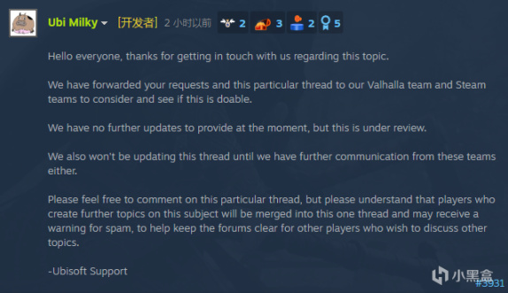 我們已將您的請求和此特定線程轉發給我們的 Valhalla 團隊和 Steam 團隊,以考慮並查看這是否可行。