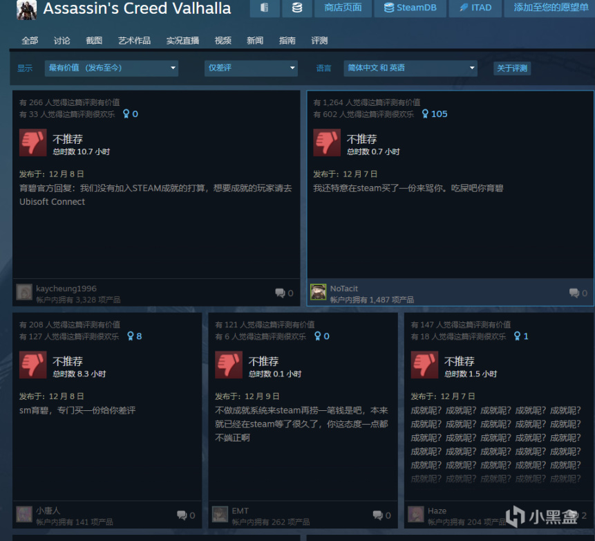 有用戶在《刺客信條:英靈殿》發售前就在Steam社區提問是否會加入成就係統,育碧官方12月8號回應暫時沒有計劃在Steam推出成就係統。如果需要成就係統可以使用育碧平臺的版本,官方這番回應之後引起玩家羣體的不滿,紛紛刷起了差評。