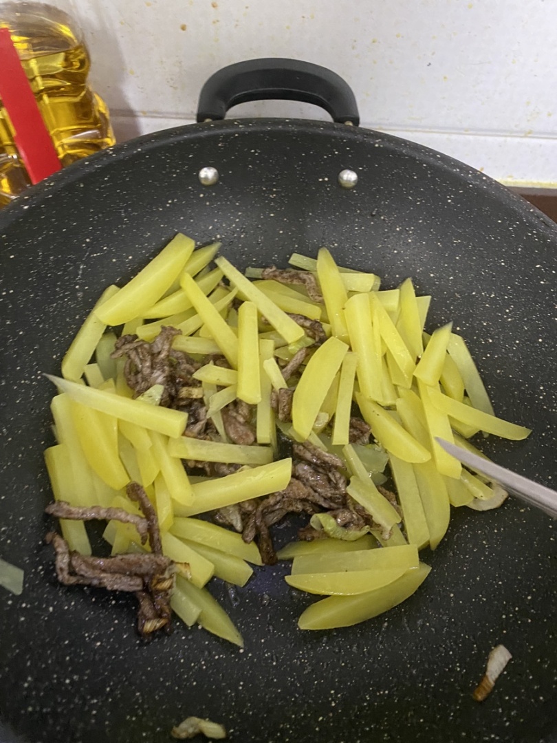 1.牛肉用料酒淀粉腌制,土豆去皮切条