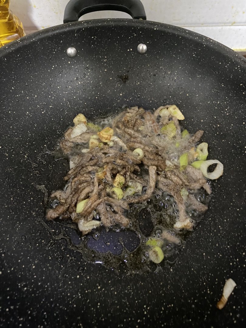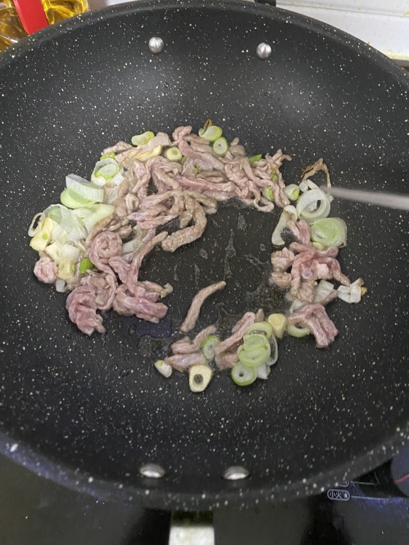 3.起锅烧油,下葱蒜煸香,倒入牛肉炒至变色,加入少许一小勺黑胡椒白胡椒粉