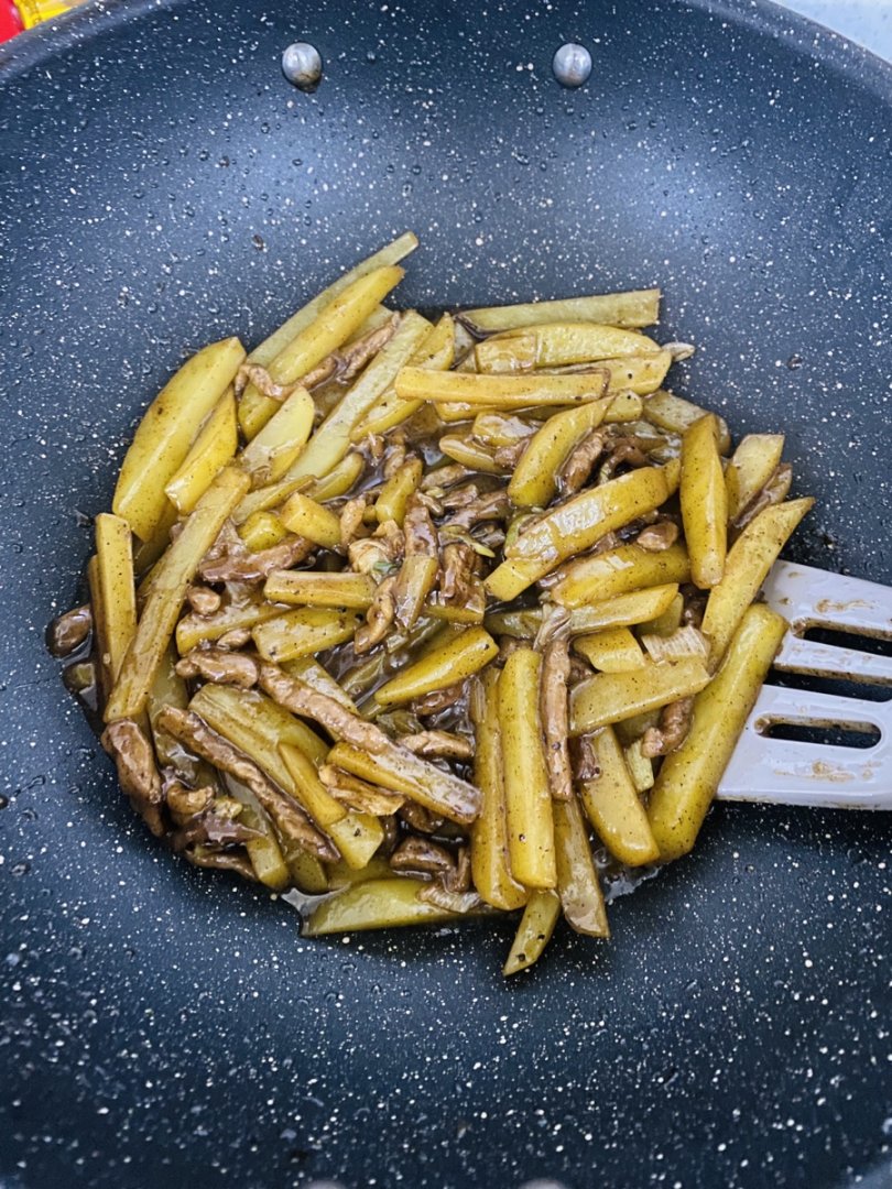 4.再倒入土豆,翻炒,加入两勺勺蚝油一勺生抽,有黑椒酱的加入两勺黑椒酱,没有的加入黑椒粉,翻炒出香味,加少许水可以勾芡,出锅前加少许鸡精
