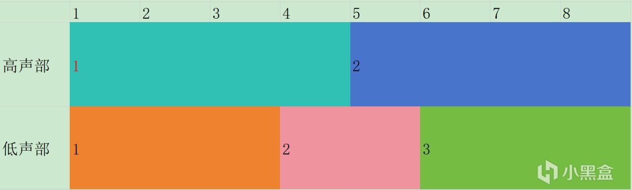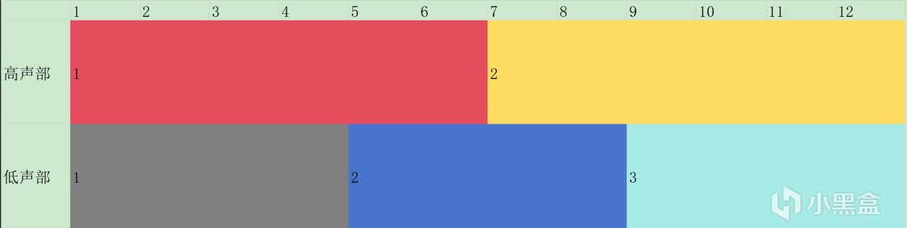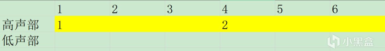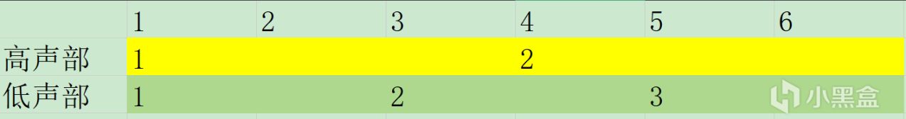 高声部与低声部第三个音同样相差两个格子,也是1/6