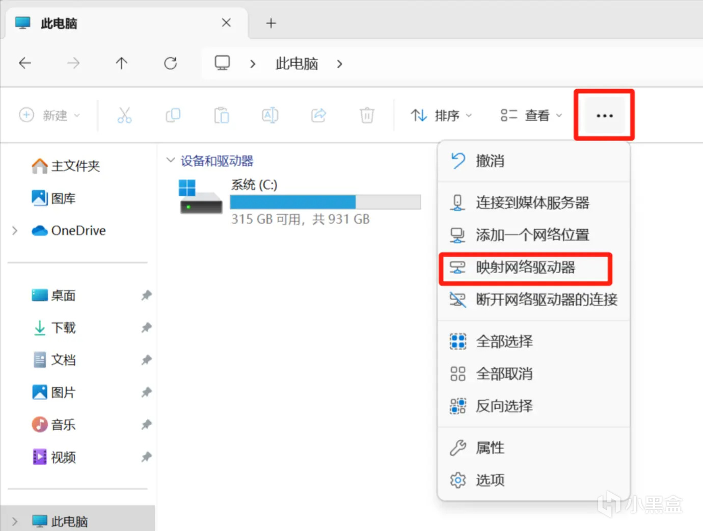 ▲紧接着,PC端进入此电脑,在菜单栏中找到三个点的按钮,选择映射网络驱动器。
