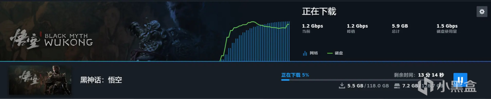 ▲紧接着便是大家熟悉的下载安装游戏的过程了,因为绿联私有云DXP480T Plus全闪NAS与路由器是万兆有线连接,路由器与光猫又是通过2.5G网口有线连接,所以直接跑满了我家的千兆光纤,下载速度达到了1.2Gbps。