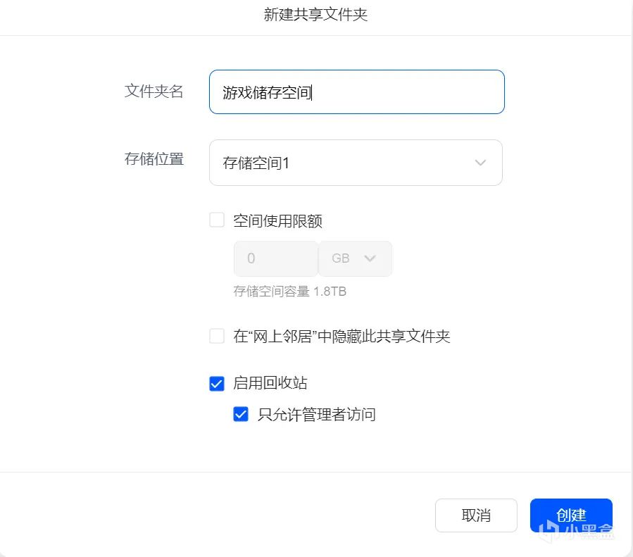 ▲新建一个共享文件夹,有需求的话也可以限制一下空间限额,避免游戏库把NAS的储存空间装满了。