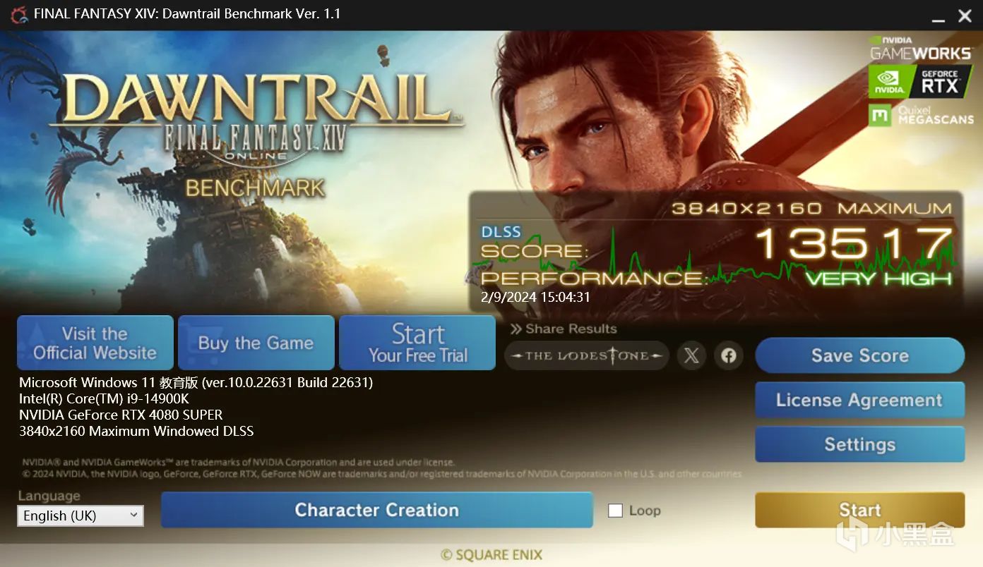 ▲而为了更好的量化游戏装在主板SSD与NAS中读取时间的差异,我们使用《最终幻想 DWADTRAIL》的Benchmark进行测试,它除了能够测试电脑性能,还能够测试电脑的加载时间,我平时测SSD的时候,也会使用这个软件。在4K分辨率,DLSS开启,最高画质的情况下,Benchmark运行在主板SSD上时得分13517。