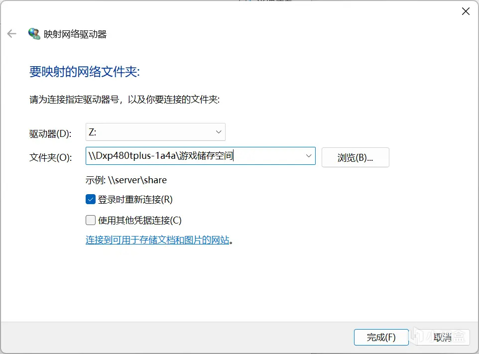 ▲直接粘贴刚才复制的内容,并在后面输入你的共享文件夹名字,比如我刚才设置的是”游戏储存空间“,现在就把这个名字输入到路径最后。