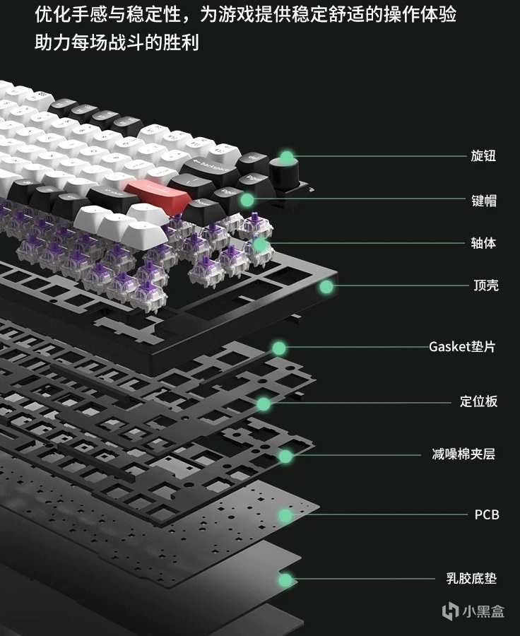 Q1HE结构方面采用了目前主流的Gasket结构,整体更加抗震,多层消音设计使得大幅降低了来自于键盘内部杂音的干扰。