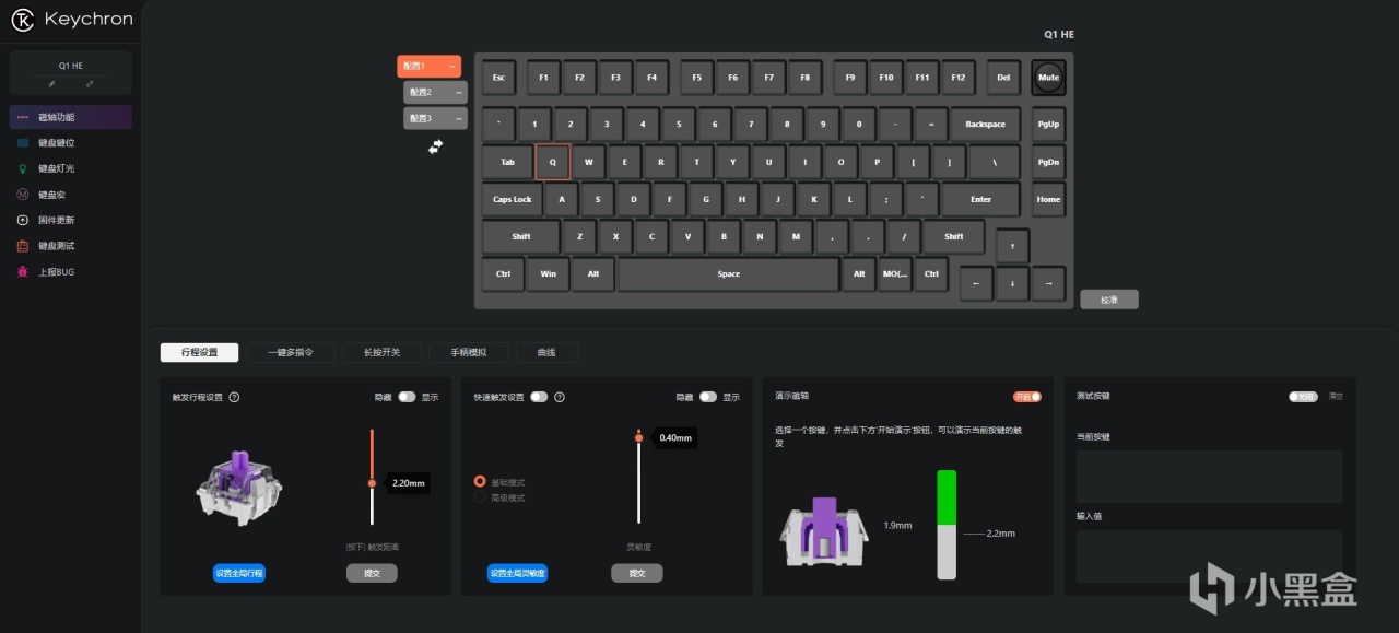 Q1HE支持对每个按键都进行单独设置,先用鼠标点击目标按键,然后就可以在下方自由调节数据了,有趣的是其还自带了一个演示动画功能,调节完成后玩家可以随时按键来查看演示,相当直观。