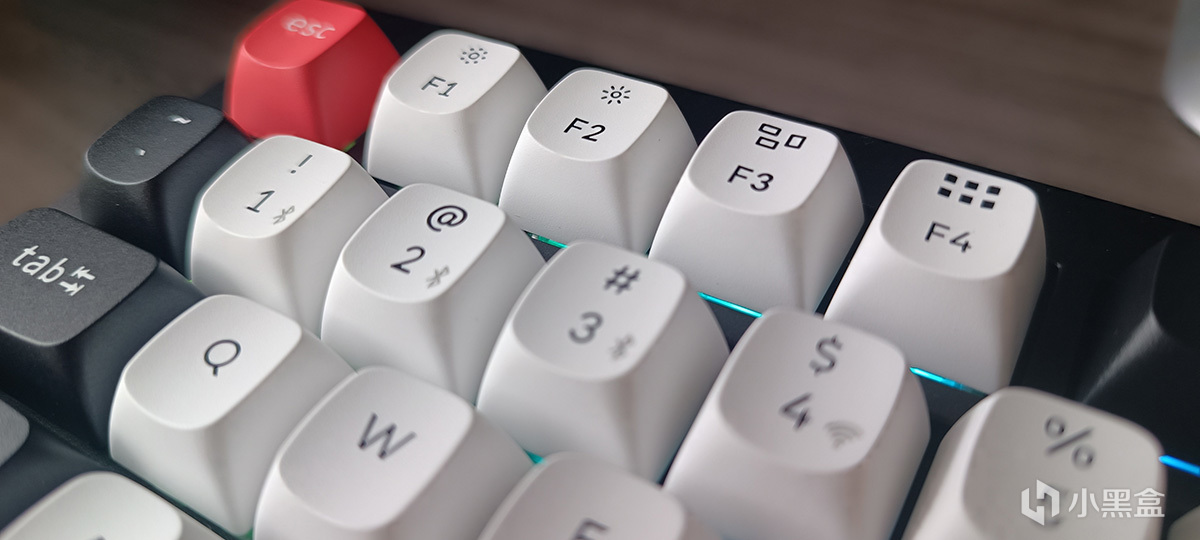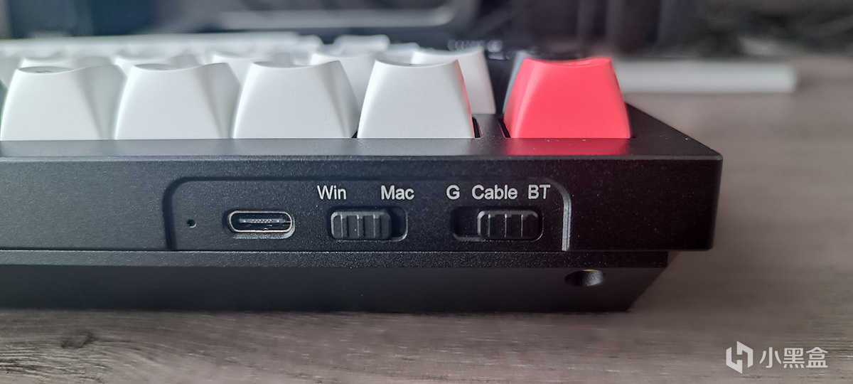 Q1HE的顶部集成了一系列功能,首先是数据线接口和Win以及Mac系统的切换按键,不愧是苹果专业户,已经考虑到多系统用户的需求了,配合自带的Win系统键帽,一把键盘两种享受。