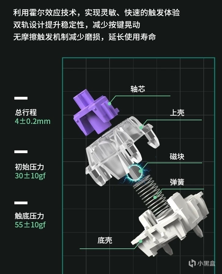 这里稍微科普下磁轴,其是利用霍尔传感器工作的,相较于传统机械结构,磁轴+RapidTrigger技术可以做到可随意调节的触发行程、更低的延迟、更顺滑的体验、更久的使用寿命等,基于前两项特点将按键调节一番后,便能实现FPS的松手急停、音游的快速重复触发等操作。