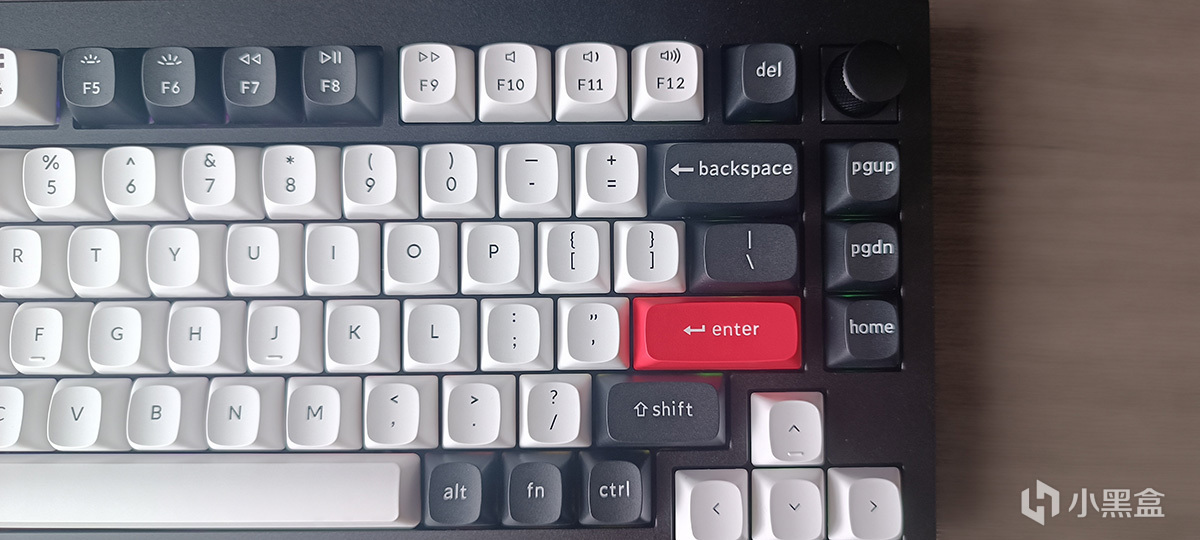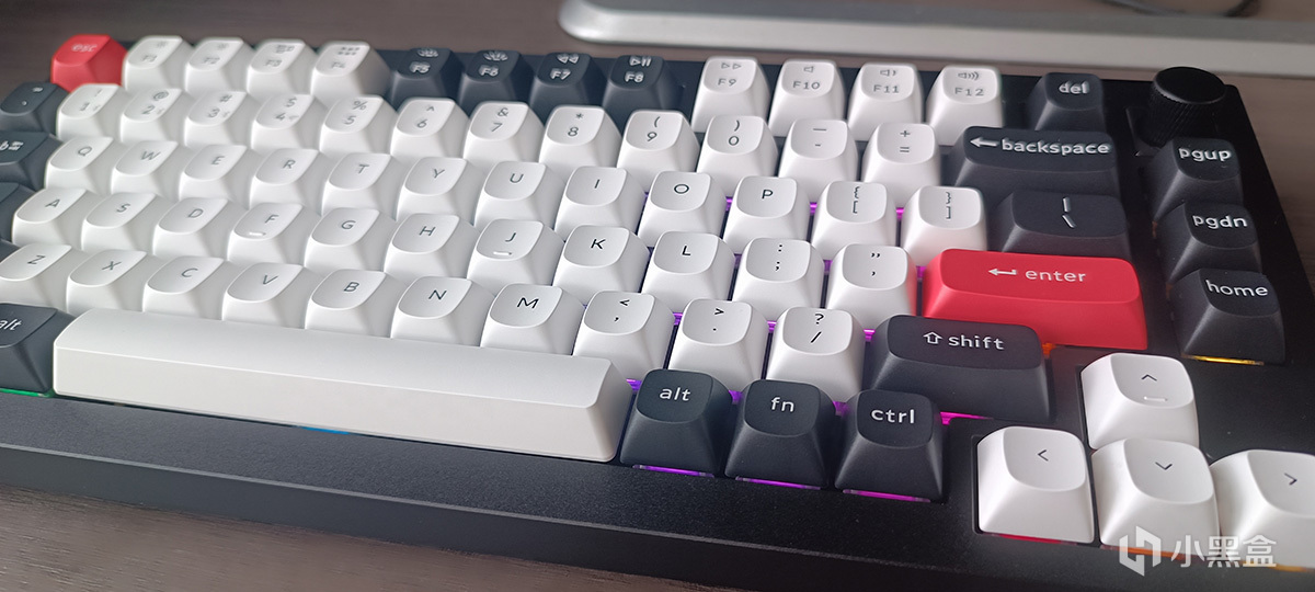 这款键盘采用了精致小巧的75配列,放在桌面上毫不占地方,游戏办公两不误,键盘的右上角加入了一个旋钮,日常调个音量简直仪式感满满。