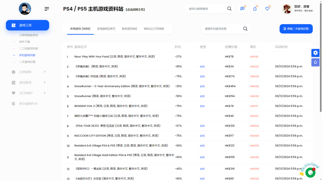 第四个功能是折扣游戏资讯。现在每次参与折扣的游戏都能进行筛选分类了。主要分为平史低(追平史低价格)、新史低和100元以下游戏这三部分。每款游戏的折扣力度、优惠价格、原价以及折扣截止时间,都能进行查阅。当然你也可以直接搜索具体的游戏名字。