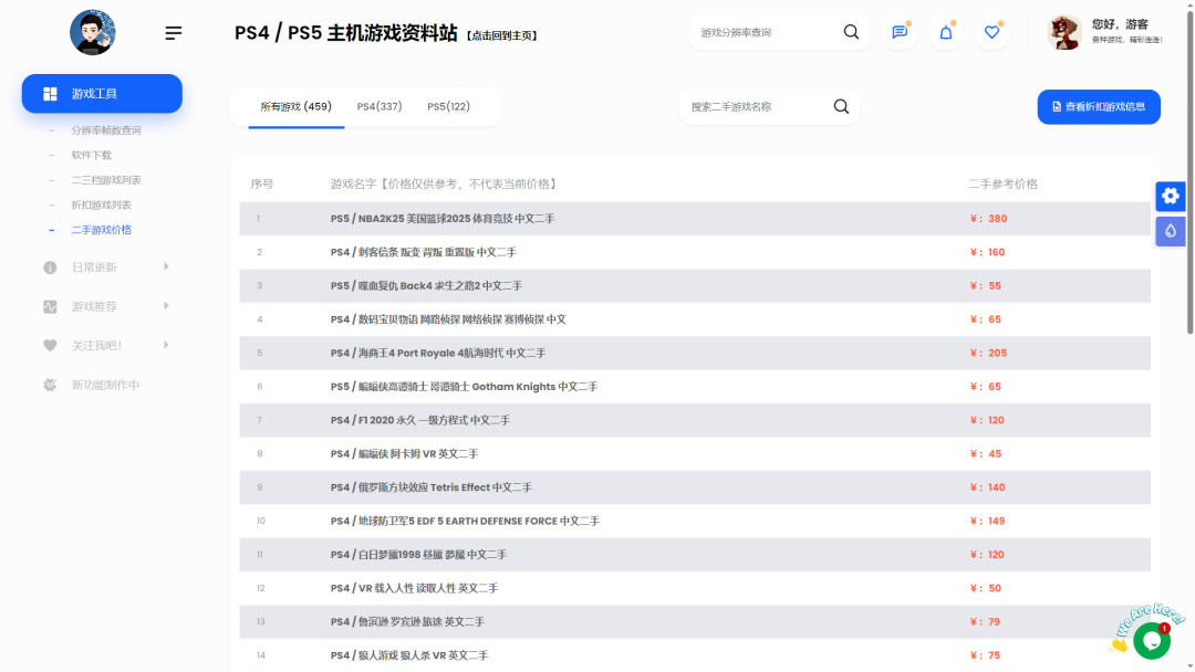 游戏工具的第一个功能-分辨率与帧数查询。这个是大家平时用的最多的。主要是查询PS4/PS5平台上游戏的具体帧数与分辨率。这份原始数据呢,是我足足花了两个礼拜进行整理的。根据从外网那边得到的数据,一个个翻译录入过来,还做了一个Excel表格。之后的一些新游戏数据,主要参考了油管UP主“数毛社”和“ElAnalistaDeBits”。