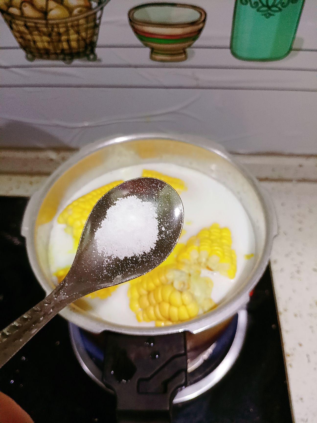 玉米去皮,去须,可以切段,也可以整个煮。加适量牛奶➕水【条件好可以全部加牛奶🥛】