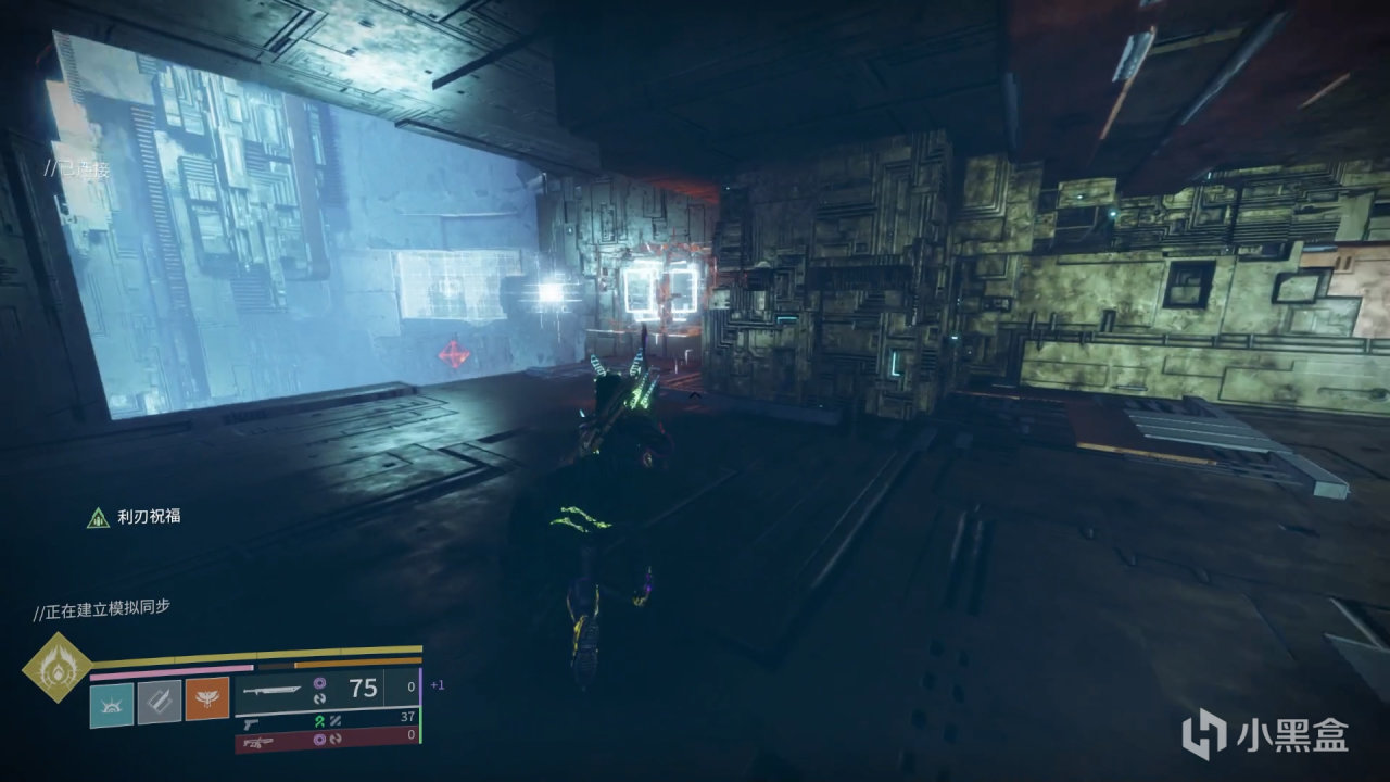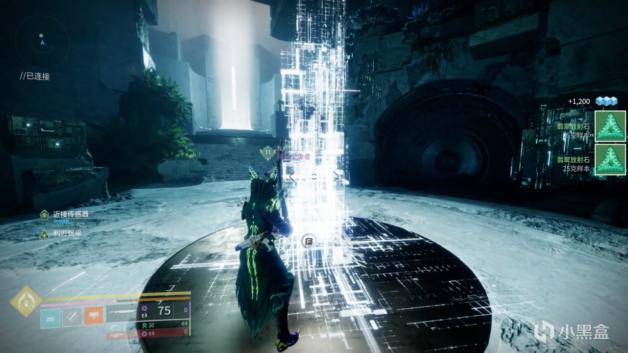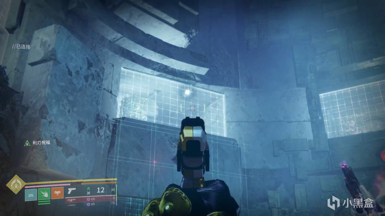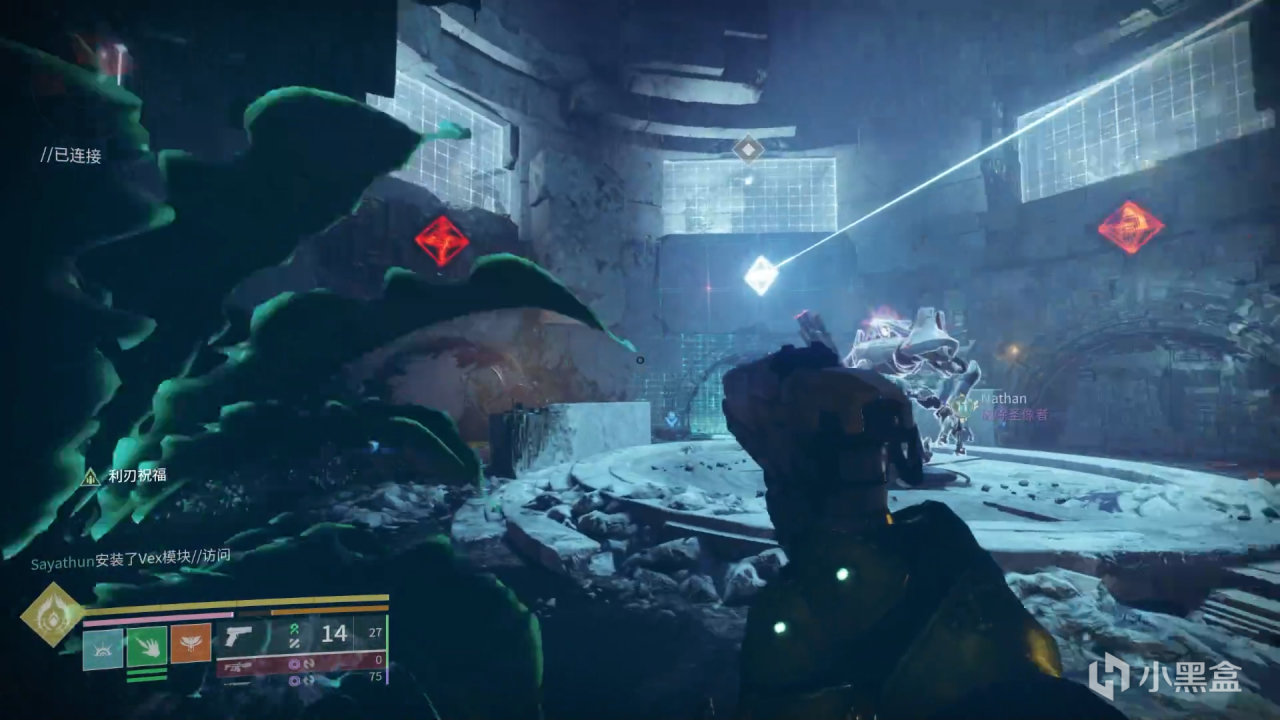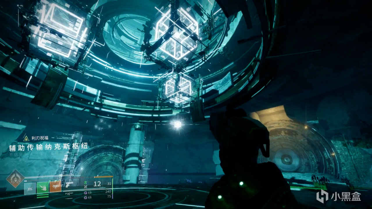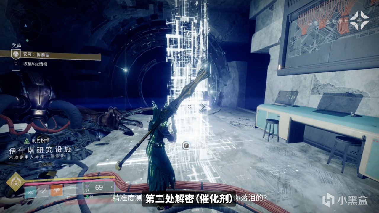 我們需要先看小方塊在哪個窗口,再把米諾陶掉落的藍色VEX模塊放在對應的門上,讓門發出的光線和小方塊下方的棱鏡相連,這樣就會通過傳送門傳送到小方塊所指示的房間