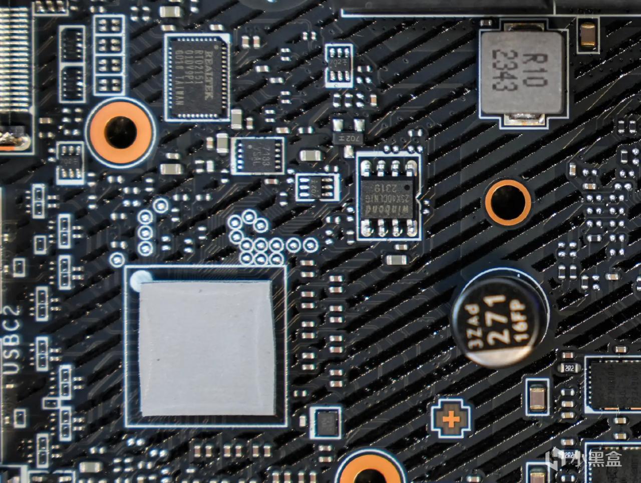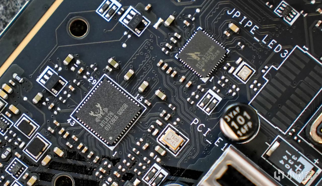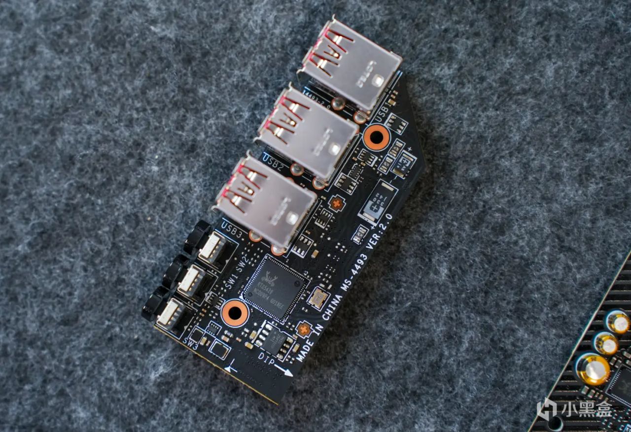 在主板的I/O接口处还有一个双层PCB,上方主要是搭载了一个瑞昱RTS5420 USB3.2 Gen2x1集线器控制器,为USB提供拓展。