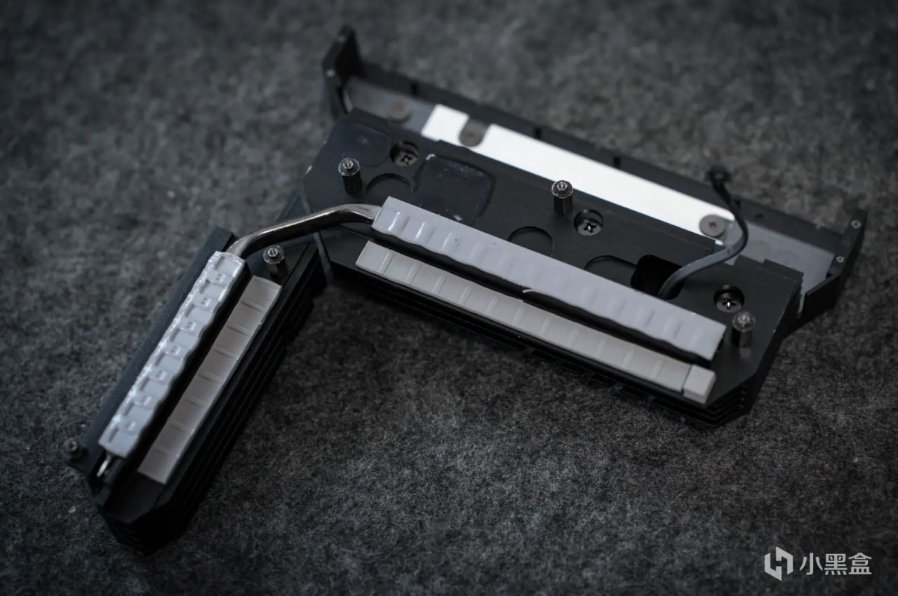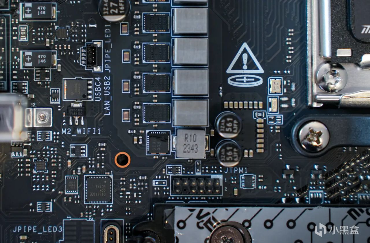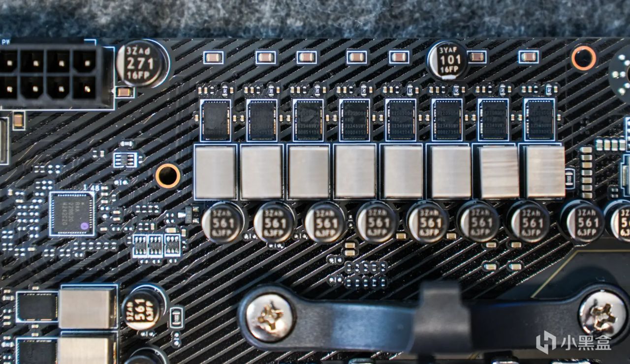 首先是整个VRM冰霜铠甲非常厚实,不仅采用了纯金属设计,还使用了复合热管以及7W/mk高效能导热贴,覆盖了整个Mos管与电感,进一步保证性能稳定释放。