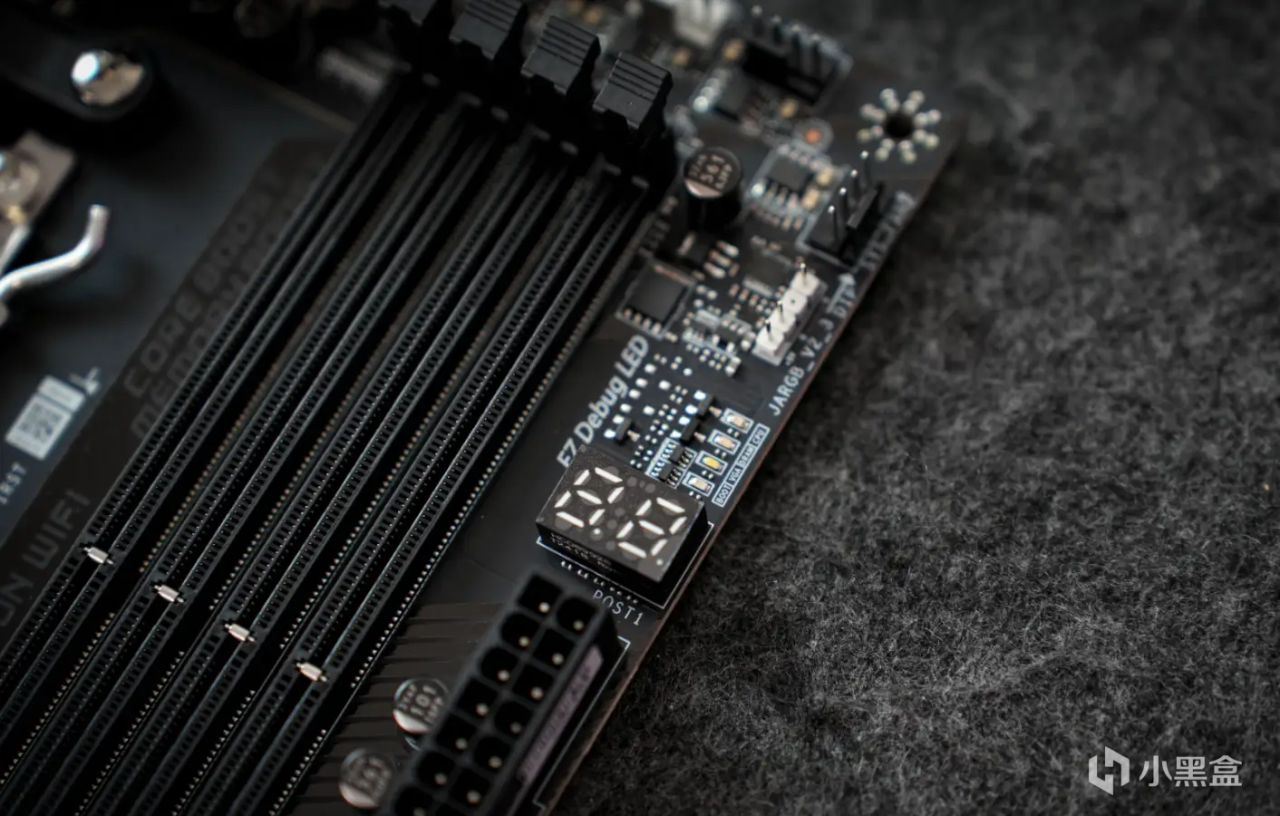 内存的右侧EZ Debug指示灯,分别是CPU、DRAM、VGA以及BOOT指示灯。下方还有一个Debug数显屏幕,不仅在开机时可显示自检码,在完成开机后还能实时显示CPU温度。