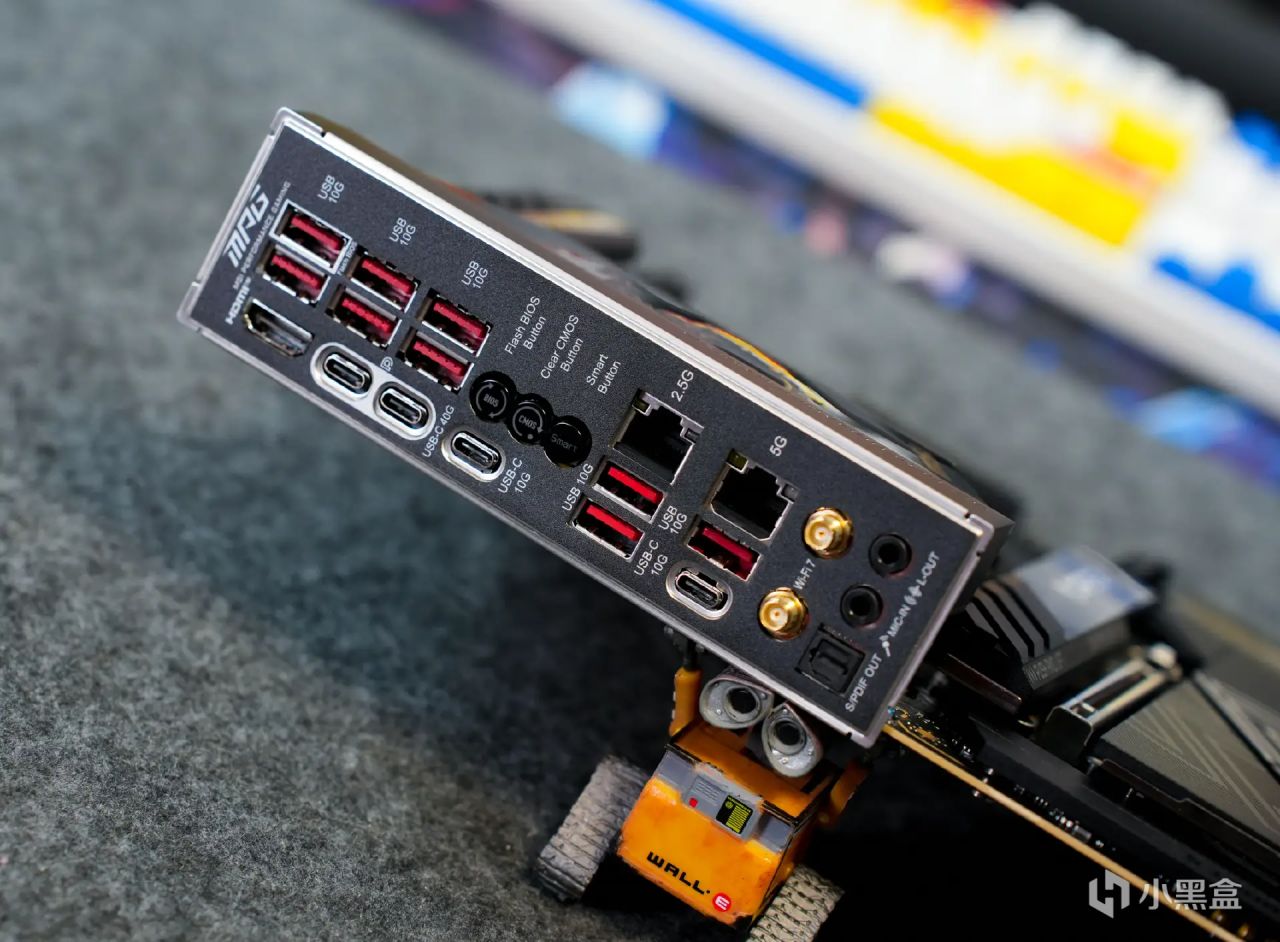 主打搭载后置为一体式I/O面板,接口可以用异常丰富来形容。微星MPG X870E CARBON WIFI暗黑主板一共搭载了9个USB Type-A 10Gbps接口,2个全功能USB4 Type-C 接口(支持DP协议视频输出),2个USB Type-C 10Gbps接口,一个HDMI 2.1视频输出口,2个RJ45网口(5Gbps+2.5Gbps)、WiFi 7天线接口以及音频接口。除此之外,还包括三个按键,分别是实体按键( Flash BIOS、Clear COMS、Smart Button)。