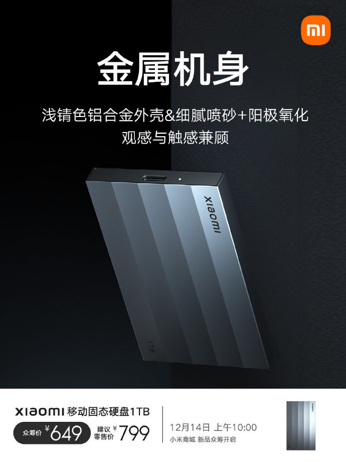 小米今天推出了一款便携数字办公的新品 —— 小米移动固态硬盘 1TB,将于 12 月 14 日上午 10:00 在小米商城开启众筹,众筹价 649 元,建议零售价 799 元。